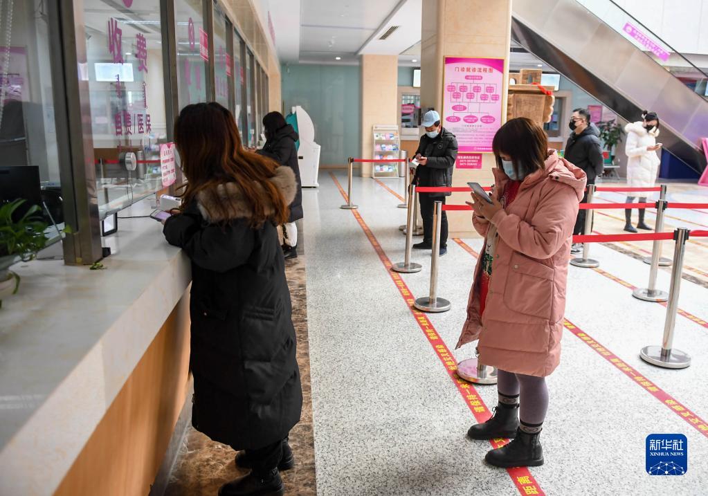 2月23日,在呼和浩特市妇幼保健院门诊楼内,就诊人员在一米线外排队等候。