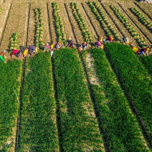 2月23日,江苏省兴化市垛田街道王横村农民在收获香葱(无人机照片)。
