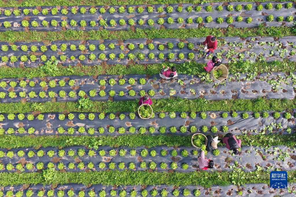 2月23日,在四川省眉山市中法农业科技园蔬菜种植基地,农民在采收蔬菜(无人机照片)。