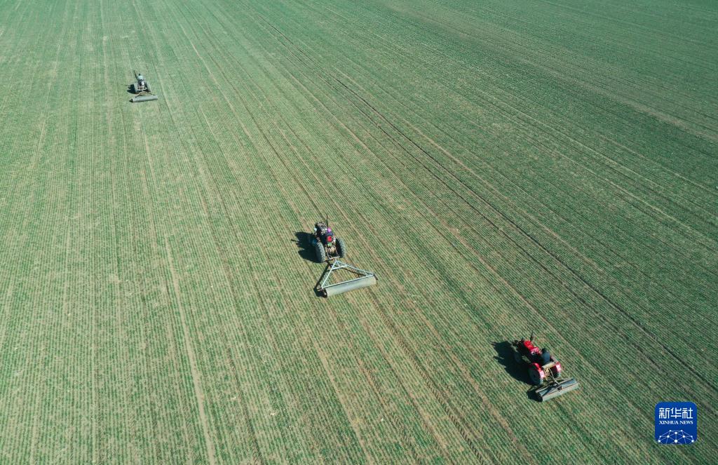 2月23日,山东省邹平市长山镇大闫村八方农场农民在小麦高质高效创建示范基地进行麦苗镇压作业(无人机照片)。