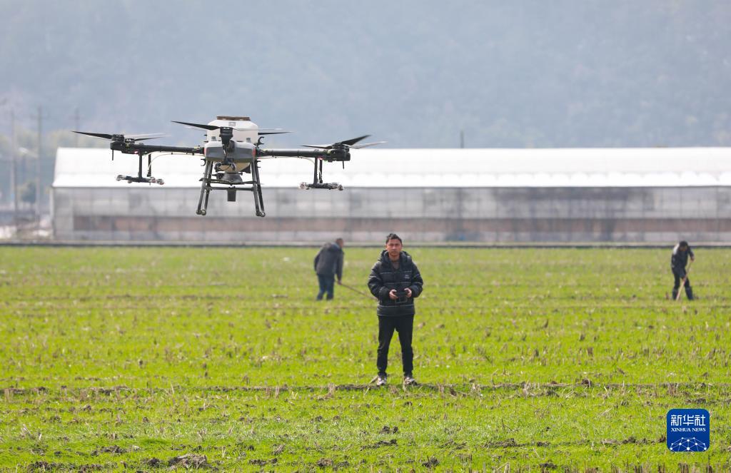 2月23日,在浙江省杭州市临安区天目山镇“天目粮仓”基地,种植户操作无人机对小麦进行施肥作业。