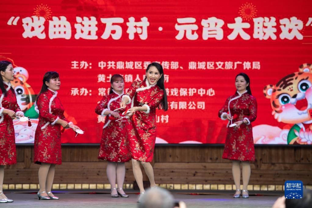 2月15日,在鼎城区黄土店镇云峰山村,杜美霜(右二)和搭档给当地村民带来“戏曲进万村·元宵大联欢”惠民演出。