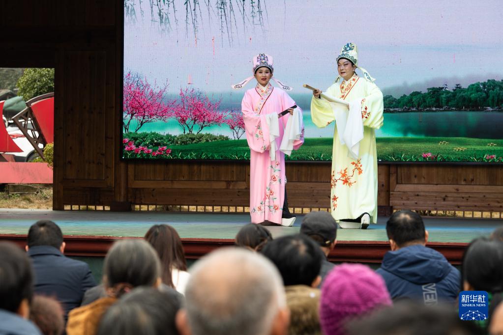 2月15日,在鼎城区黄土店镇云峰山村,杜美霜(左)和搭档给当地村民带来“戏曲进万村·元宵大联欢”惠民演出。