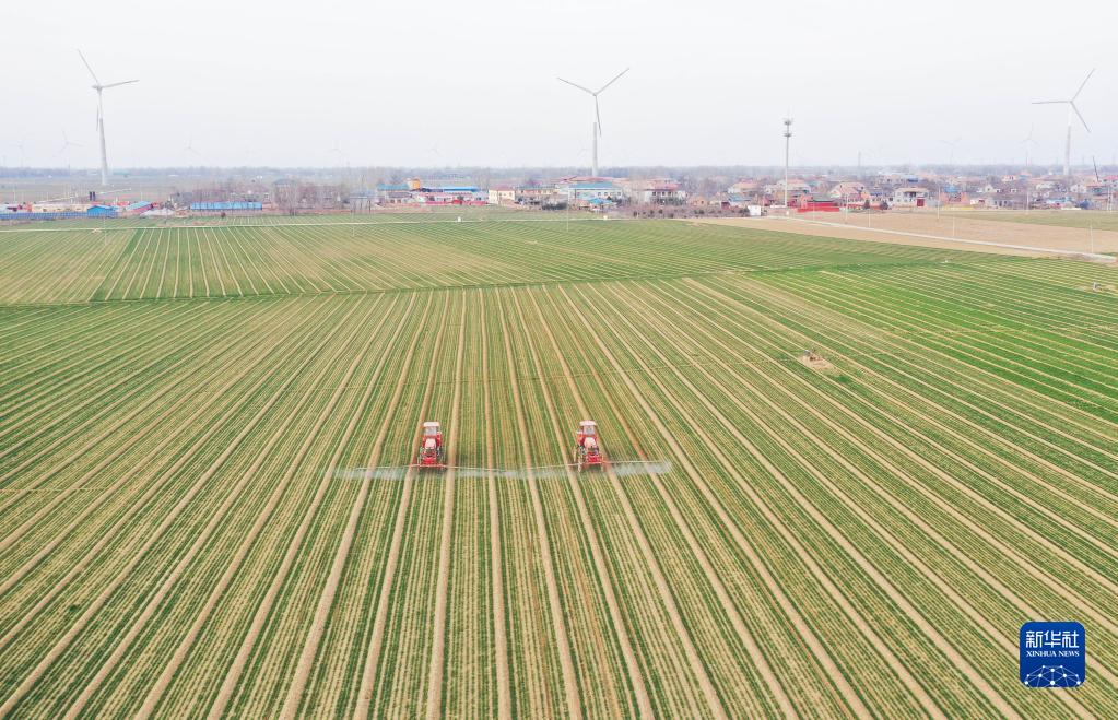 2月22日,在河南省安阳市滑县万古镇杜庄村,焕永种植农民专业合作社人员驾驶自走式喷雾机在麦田作业(无人机照片)。