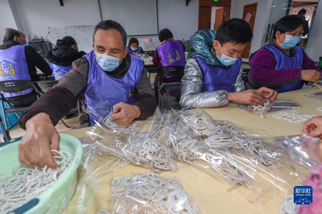 2月22日,在湖州市织里镇港西村残疾人之家,来自周边的残疾人(包括精神残疾、智力残疾和肢体残疾)正在打包配件。完成工作后,他们可以获得相应报酬和补贴。