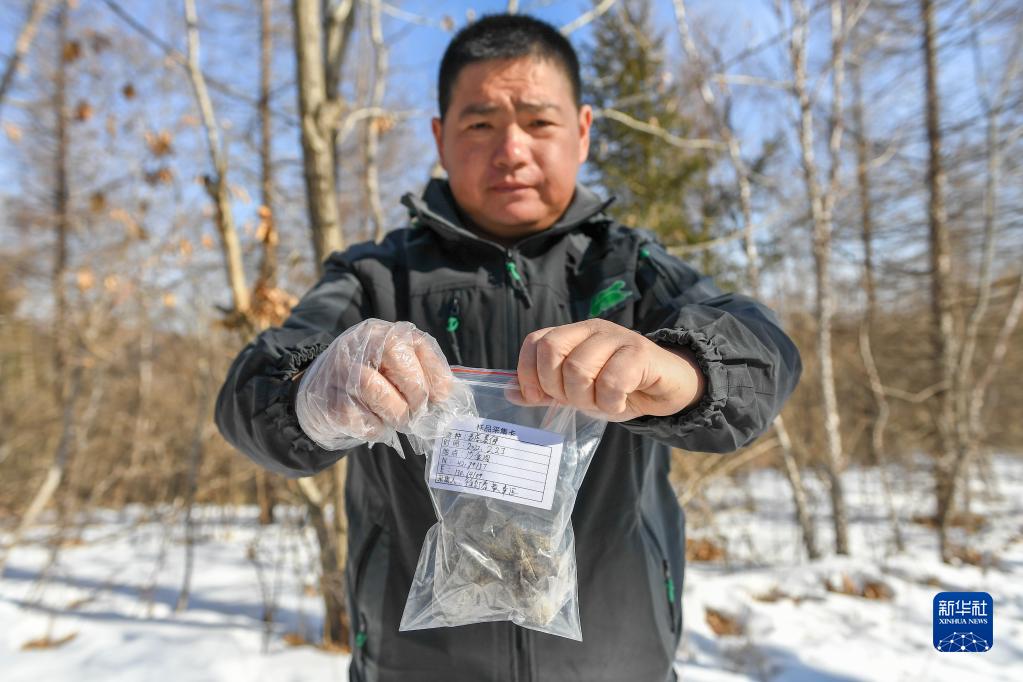 2月23日,巡护员徐衍春展示采集的东北虎粪便样本。