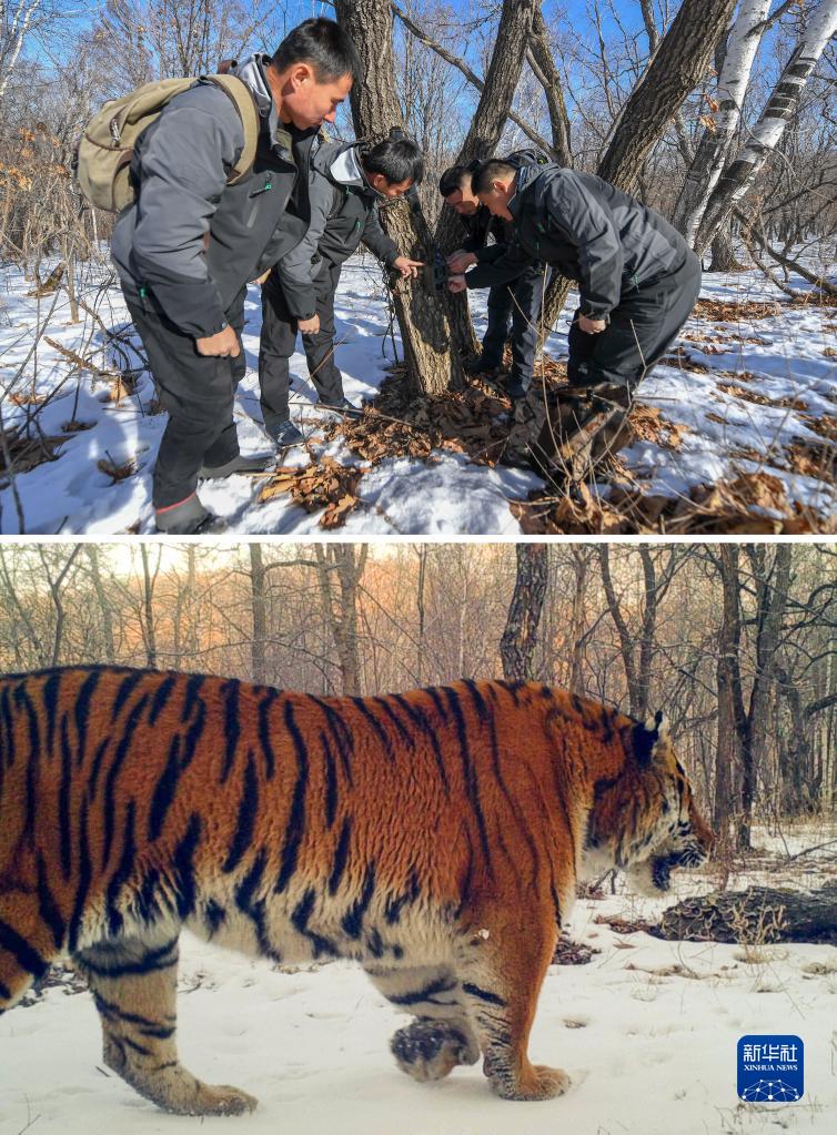 拼版照片:上图为2月23日,巡护员王俊江、黄幸运、郎辉和徐衍春(从左至右)调试监测相机(新华社记者张楠摄);下图为监测相机拍摄到的野生东北虎(2020年1月21日摄,东北虎豹国家公园管理局供图)