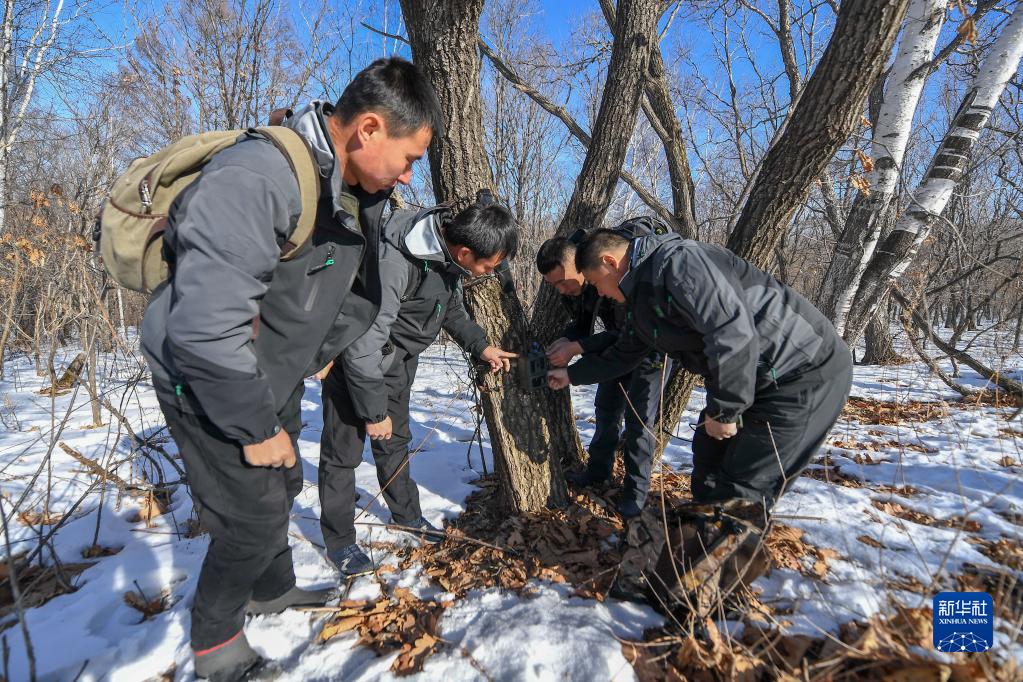 2月23日,巡护员王俊江、黄幸运、郎辉和徐衍春(从左至右)调试监测相机。