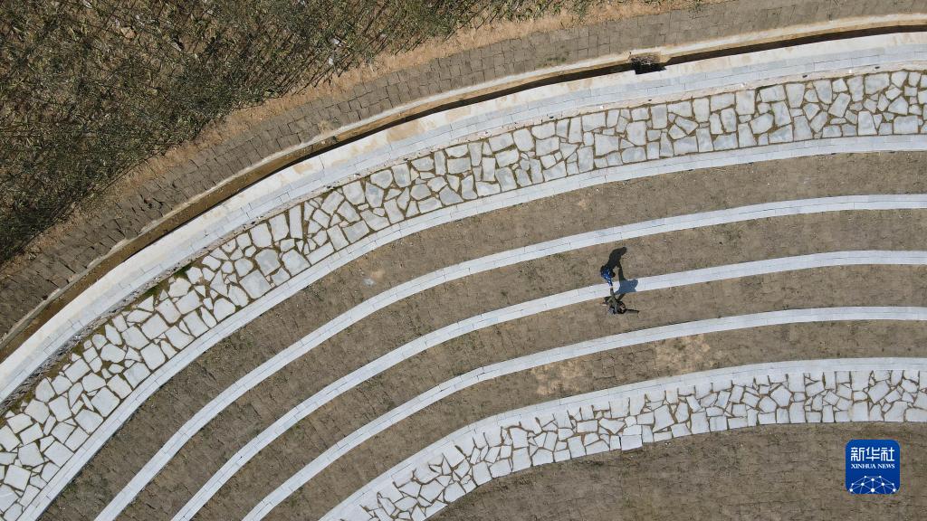 2月24日,刘琳与当地孩子在她参与规划设计的万涧村溪畔剧场玩耍(无人机照片)。