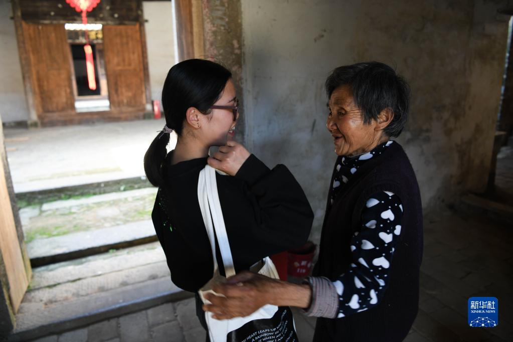 刘琳(左)在万涧村与杨家老屋里的居民交流(2021年3月25日摄)。