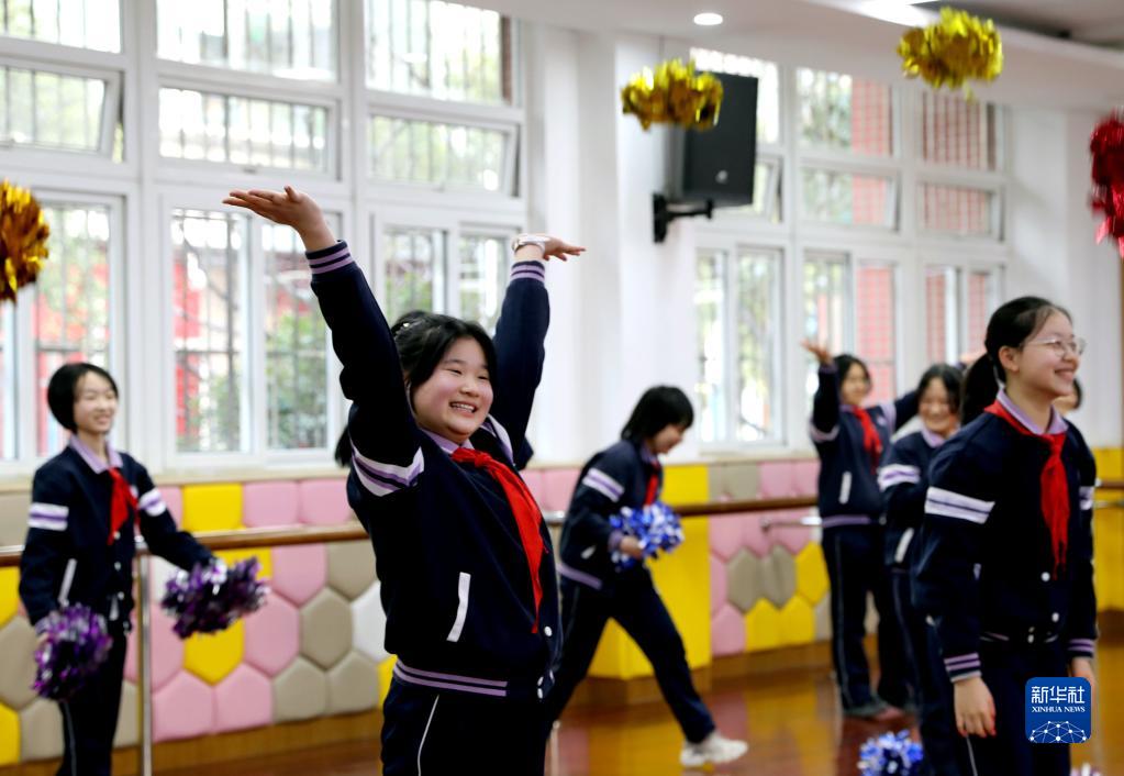 2月23日,在课后服务时间,格致初级中学的学生在啦啦操社团课程中练习。