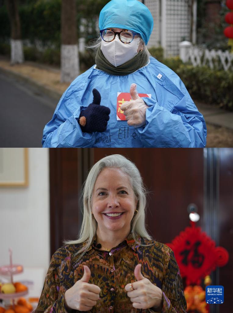 拼版照片:上图为在苏州工业园区西湖社区青湖丽苑小区核酸采样点,美国志愿者施爱伦在为苏州加油(2月18日摄);下图为施爱伦在融荟文化交流中心(2月21日摄)。施爱伦是当地融荟文化交流中心国际志愿者团队成员。作为志愿者,她在小区核酸采样点帮助外籍人士登记信息、维持秩序、讲解注意事项。