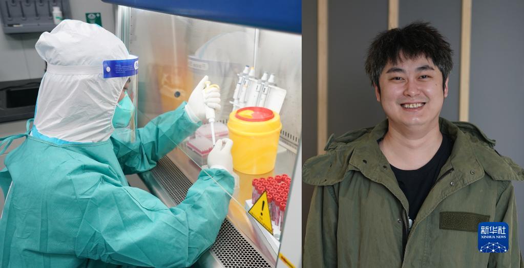 拼版照片:左图为在爱普益(苏州)医学检验实验室有限公司,耿岳在样本制备区忙碌(2月17日摄);右图为耿岳在苏州高新区一家酒店的房间内(2月23日摄)。耿岳和同事于2月14日从北京总部来到苏州分公司,增援核酸检测工作。