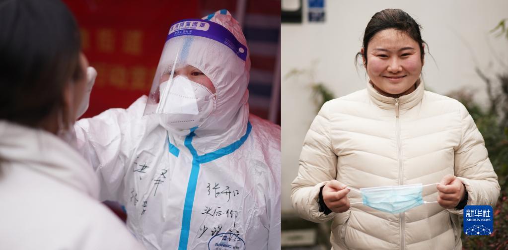 拼版照片:左图为在苏州市姑苏区沧浪街道西美社区核酸检测点,护士张芹在帮市民进行核酸采样;右图为张芹结束采样任务、完成消杀后,换口罩瞬间留影(2月22日摄)。“希望我们可以早日战胜这场没有硝烟的战争,恢复这座城市往日的美好和温暖。”张芹说。