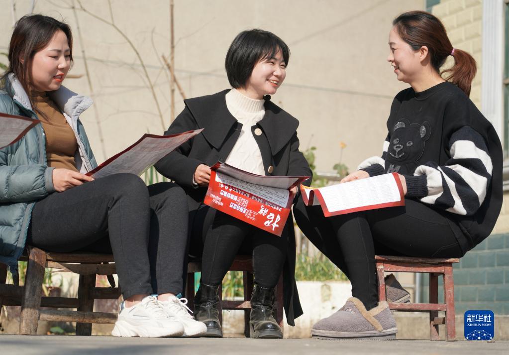 2月24日,汉滨区建民街道忠诚村党支部委员、村监委会主任胡代芝(中)向村民发放讲解社区工厂招聘彩页。