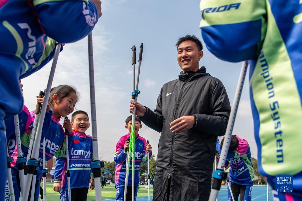 2月24日,在重庆树人博文小学的冰雪运动体育课上,体育老师向孩子们讲解旱地滑雪的技术要领。