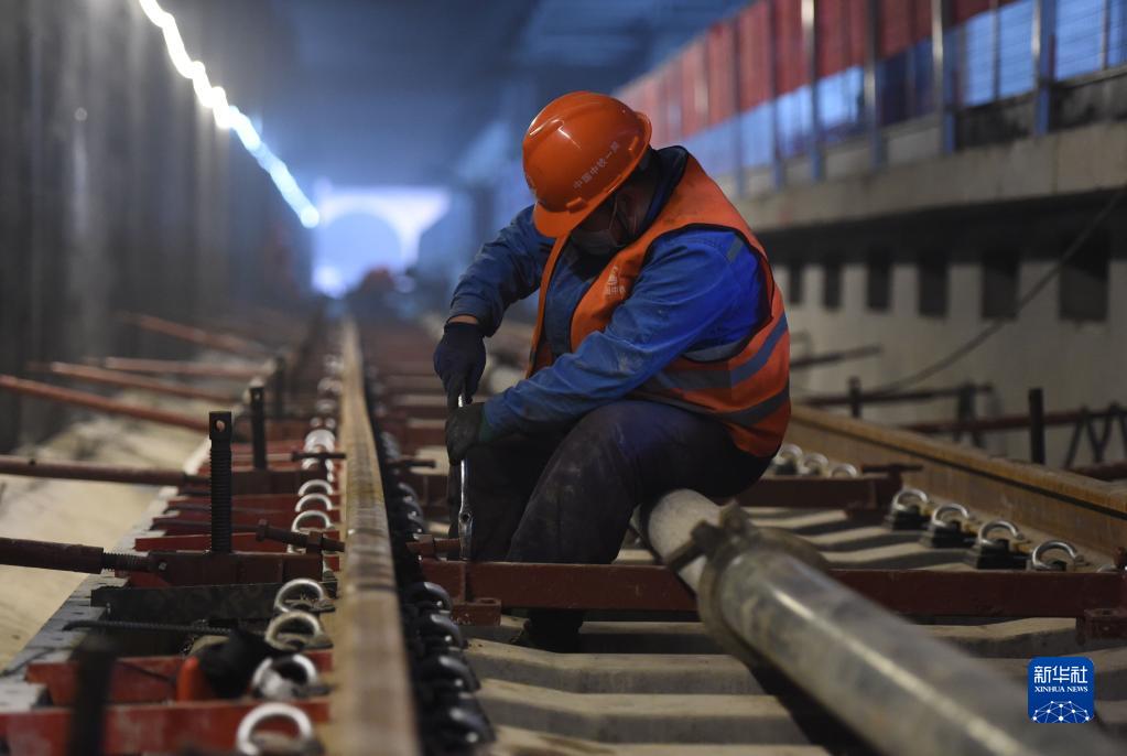 2月25日,工人在合肥轨道交通1号线三期施工现场进行铺轨作业。