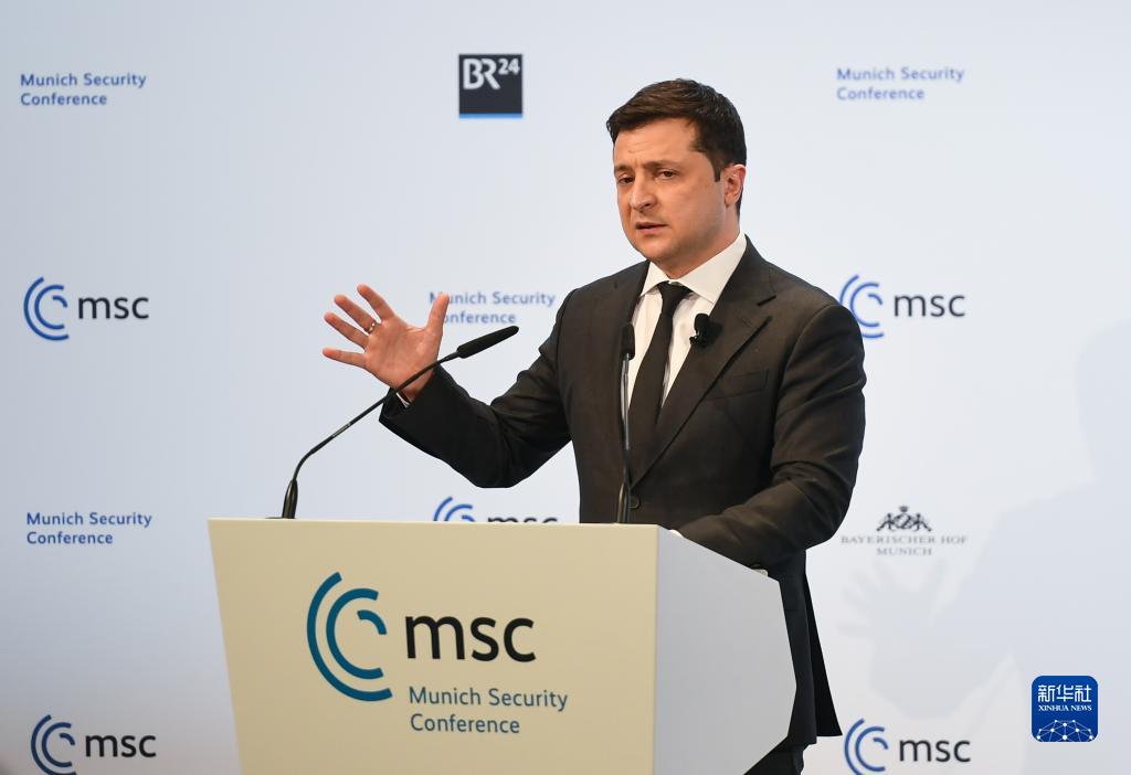 2月19日,在德国慕尼黑,乌克兰总统泽连斯基在第58届慕尼黑安全会议(慕安会)上发言。