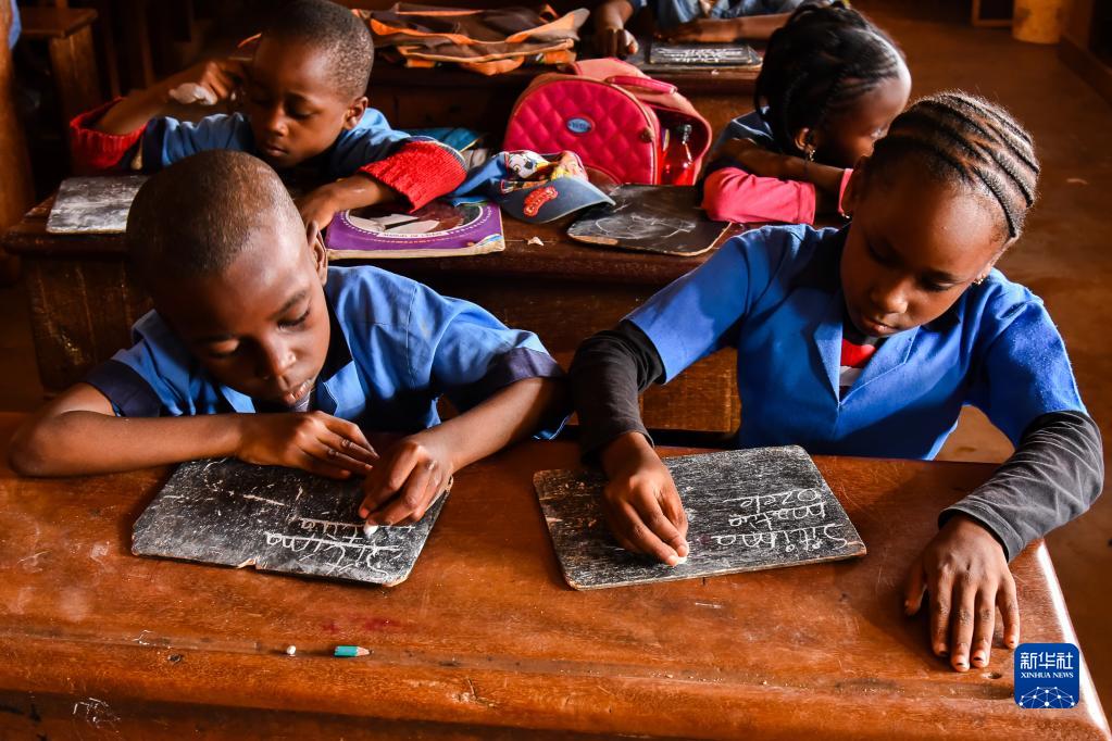 2月14日,在喀麦隆首都雅温得,一所公立学校的学生们在木板上书写本土语言艾旺多语。