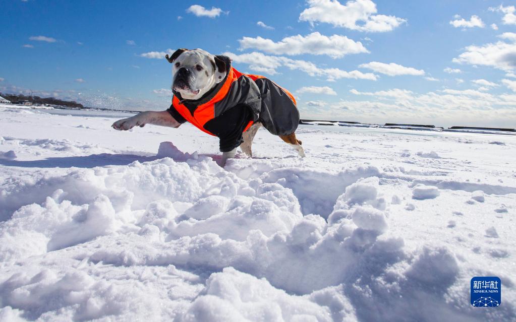 2月18日,在加拿大多伦多,一只宠物狗在公园的雪地里玩耍。