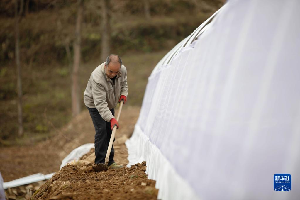 2月25日,重庆市秀山土家族苗族自治县溶溪镇罗家村村民在大棚外围封土。