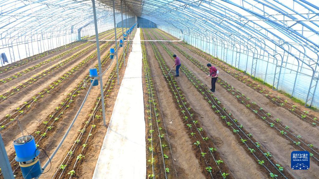 2月25日,在山东省聊城市茌平区贾寨镇耿店村温室大棚,村民给种植的香瓜松土(无人机照片)。