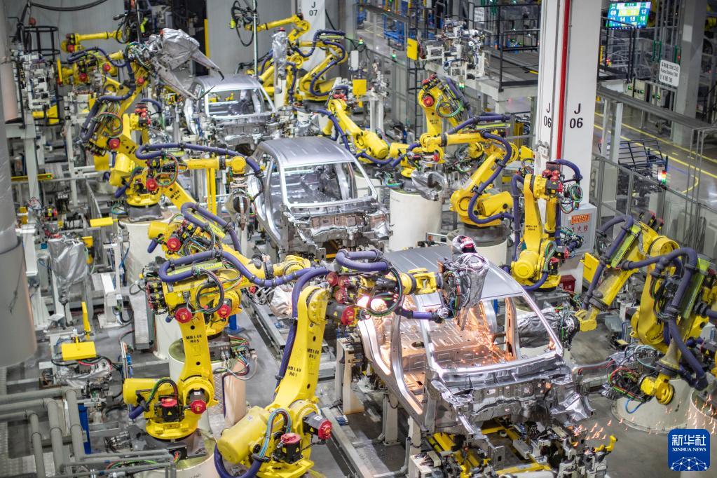 重庆一家新能源汽车企业使用智能化焊接机器人进行焊接作业(2021年4月2日摄)。