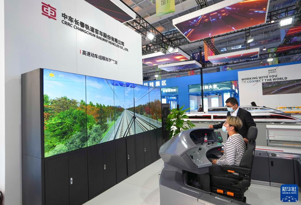 参观者在吉林省长春市举行的中国—东北亚博览会现场体验高速动车组模拟驾驶(2021年9月24日摄)。