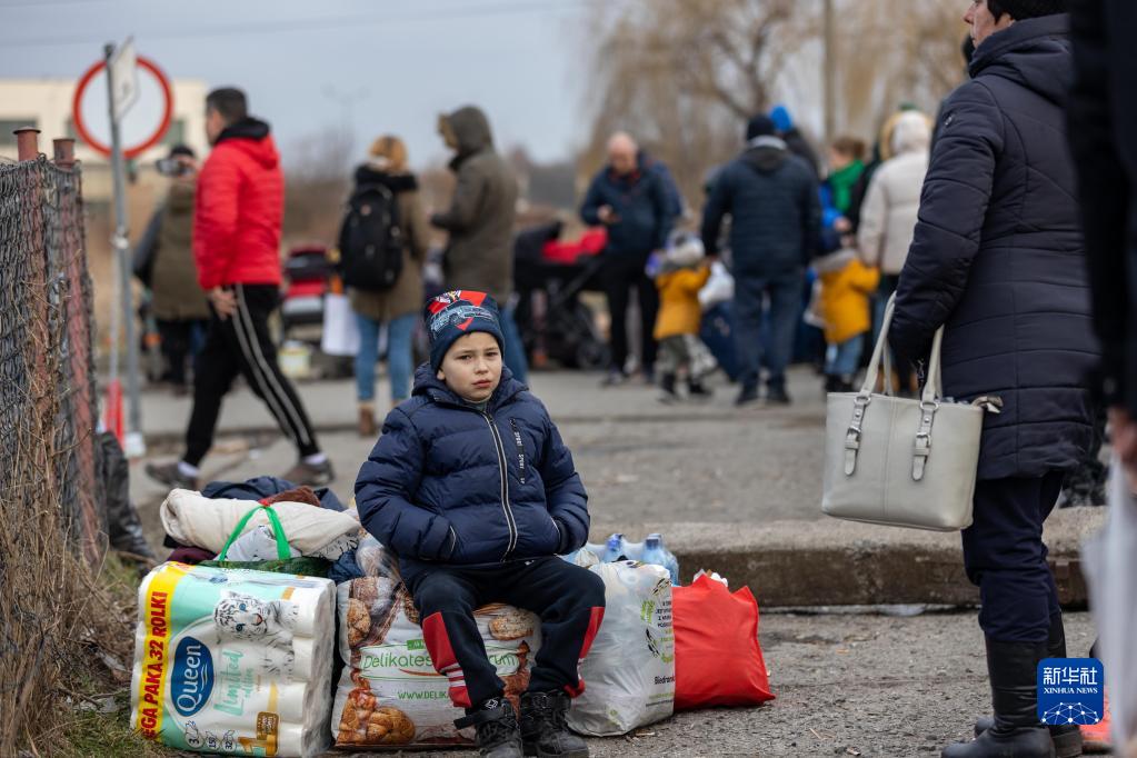 2月26日,一名乌克兰男孩抵达波兰边境口岸梅迪卡。