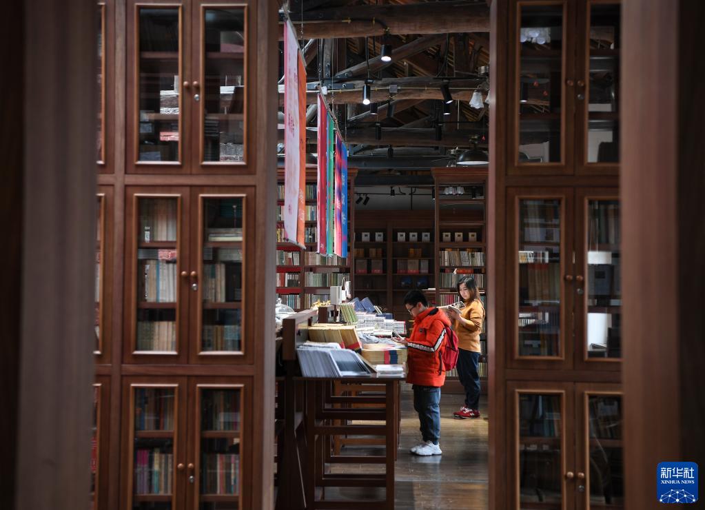 2月26日,游客在重庆山城巷一间用学校旧址改造成的图书馆内阅读。