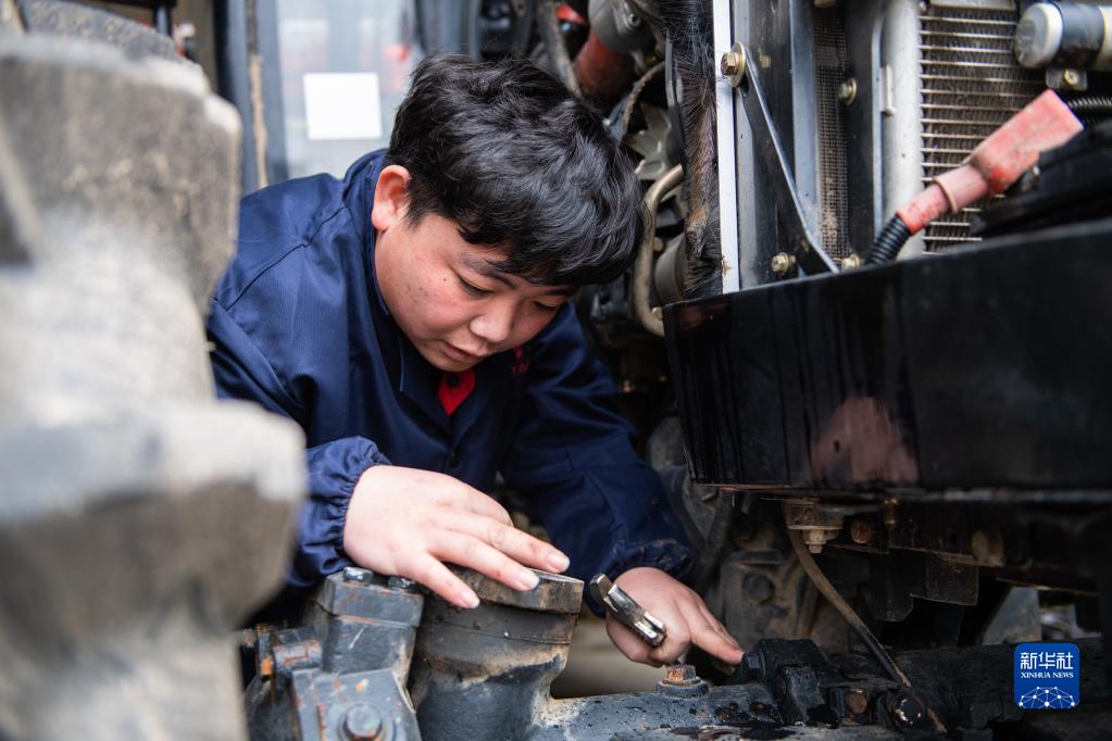 2月21日,罗智鹏在湖南常德市桃源县郑家驿镇裕农农机专业合作社维护农机。22岁的罗智鹏2018年回到家乡,随父亲学习农机操作。三年多来,他已经熟练掌握了插秧机、抛秧机、拖拉机等多种农机的驾驶与操作,每年在当地农机专业合作社服务农田约1500亩,个人综合收入达到十多万元。