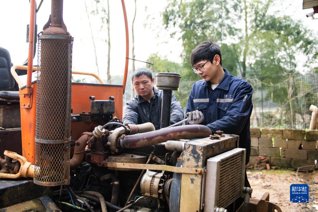 2月23日,杨建斌(右)在湖南益阳市资阳区迎风桥镇黄花仑村为村民提供农机上门检修服务。21岁的杨建斌在益阳市资阳区一家农机制造企业工作,主要负责农机动力与变速箱的整装调试以及农户农机的日常维修。参加工作才一年多,杨建斌的月薪已达到7000元。他的短期目标是通过不断学习,在未来几年内成为月薪破万的中级技工。