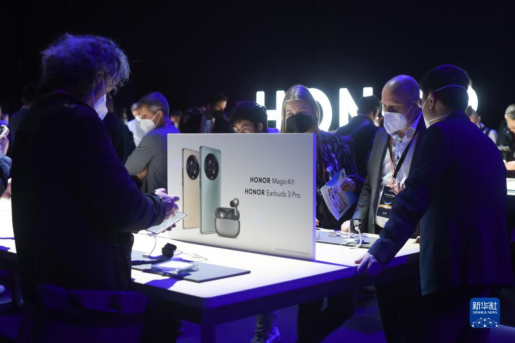 2月28日,人们在西班牙巴塞罗那2022世界移动通信大会上体验荣耀新产品。