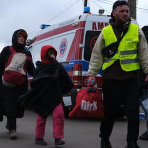 2月28日,一名志愿者陪同来自乌克兰的人们离开波兰梅迪卡口岸。