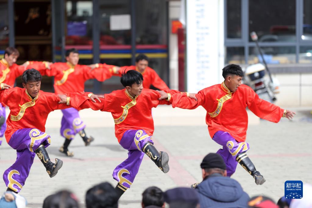 搬迁牧民在搬迁点广场上跳起民族舞蹈,迎接藏历新年(2月28日摄)。