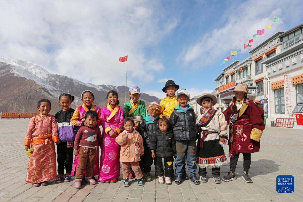 部分搬迁牧民家的孩子在搬迁点广场上合影,他们当中大一点的出生在荣玛,最小的几个出生在古荣(2月28日摄)。