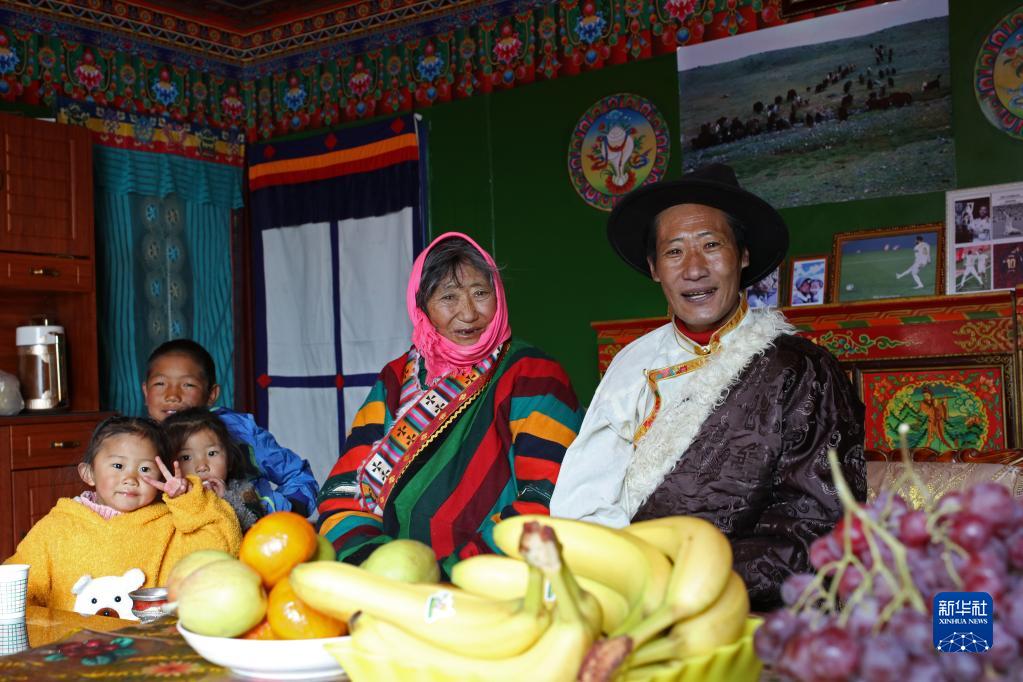 搬迁牧民仁增(右一)一家为藏历新年购买了很多新鲜水果,他的小女儿古荣卓玛(左一)是搬迁点第一个出生的孩子(2月28日摄)。