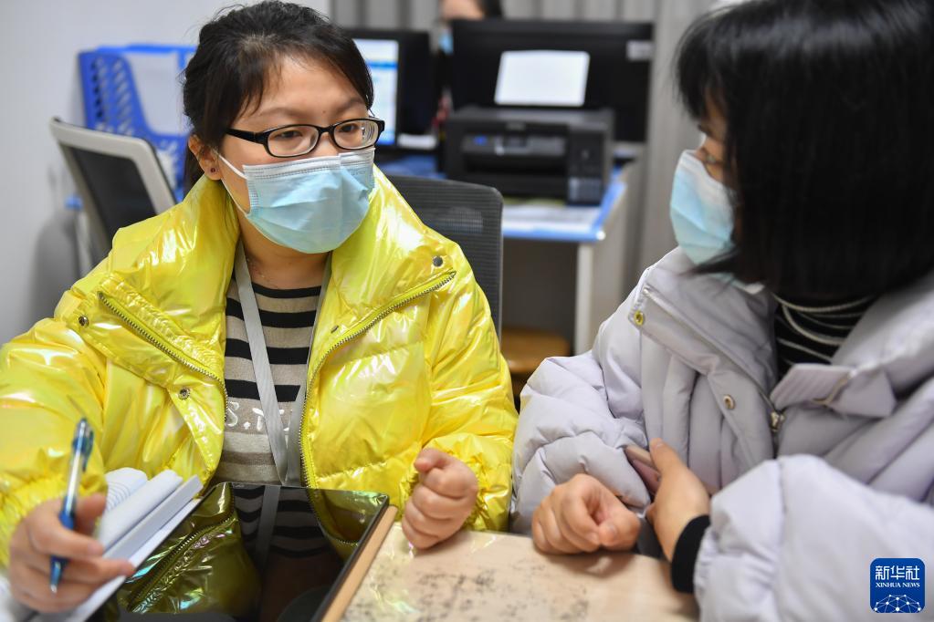 3月1日,湖南省妇幼保健院的工作人员(左)为孕妇解答问题。