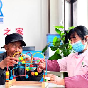 3月1日,在日照市岚山区黄墩镇“如康家园”残疾人之家,工作人员陪护老人进行益智锻炼。