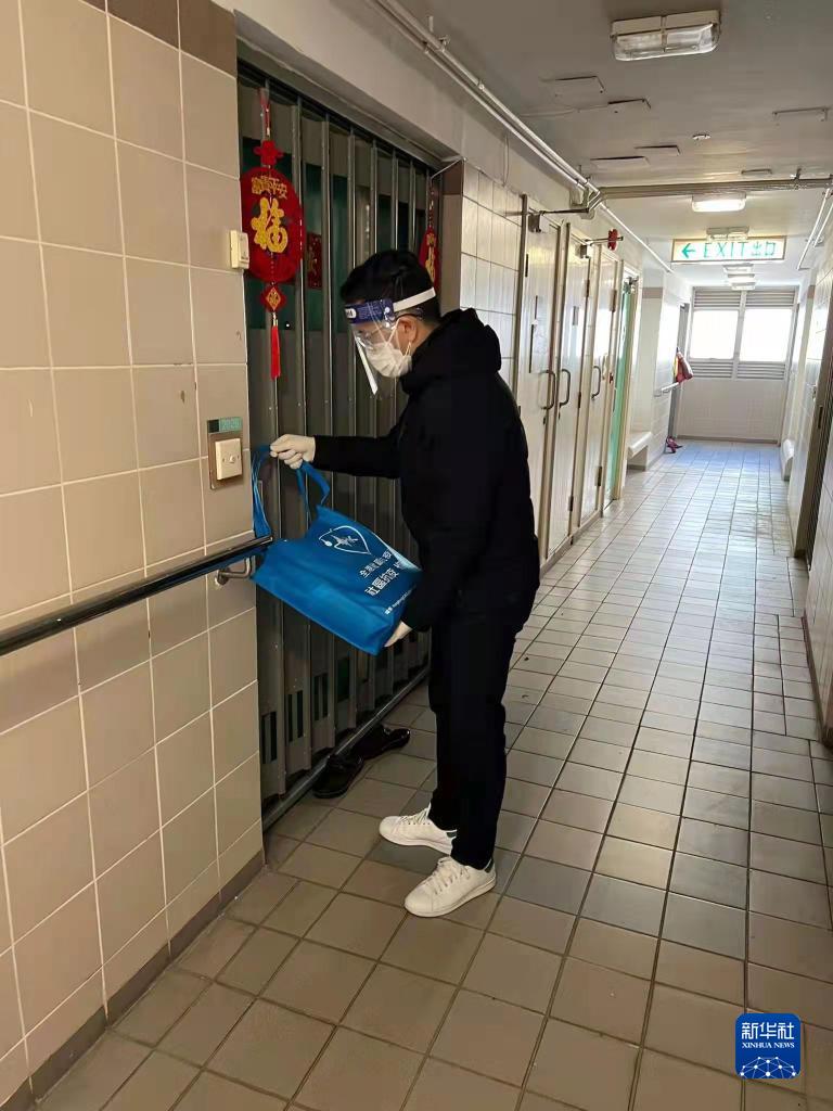 全港社区抗疫连线义工向确诊市民家庭送上中央援港抗疫物资(2月26日摄)。新华社发(全港社区抗疫连线供图)