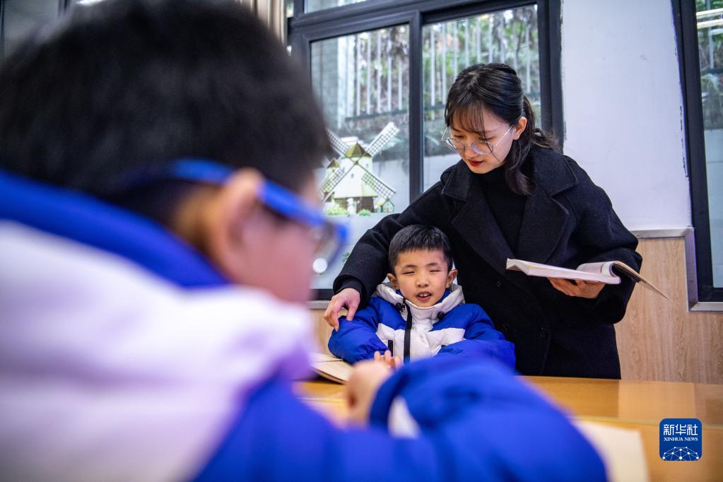 2月23日,重庆市特殊教育中心老师在文化课上矫正学生的坐姿。