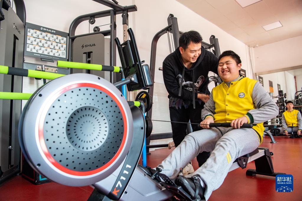 2月23日,重庆市特殊教育中心老师在体育课上指导视力障碍学生使用健身器材。