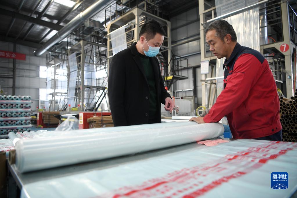 来自福建的商人郑开煌(左)在位于宁夏隆德县闽宁扶贫产业园的农用薄膜生产线查看产品质量(1月28日摄)。
