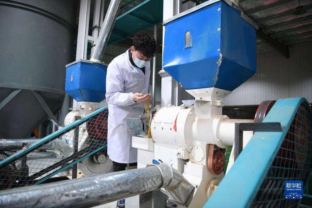 在福建资金帮扶下建成的宁夏中卫市海原县贾塘乡锦彩生态农业公司,工人在检查小杂粮生产情况(2月28日摄)。