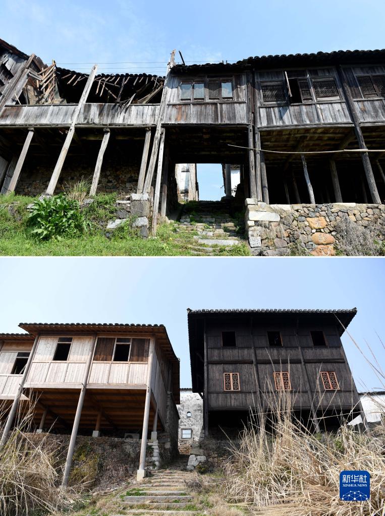 这是一张拼版照片:上图是修缮前的建筑“吊栋阁”(2015年3月28日摄);下图是完成部分修缮施工的建筑“吊栋阁”(3月2日摄)。