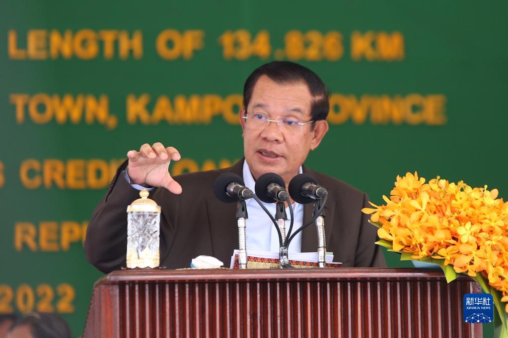 3月2日,柬埔寨首相洪森在柬南部茶胶省的中国援柬3号公路改扩建项目通车典礼上讲话。