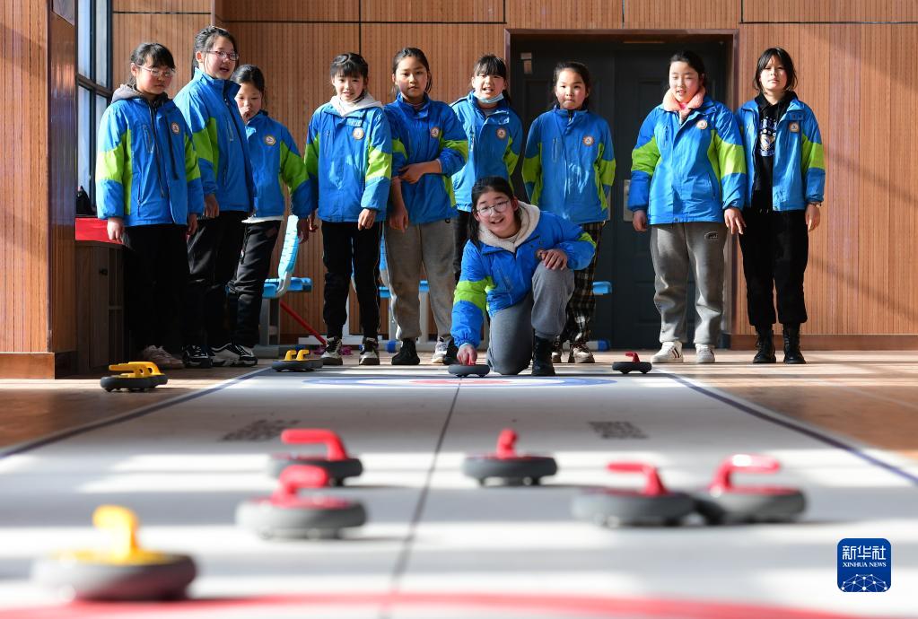 3月2日,在肥西县严店中心学校少年宫,学生体验旱地冰壶。