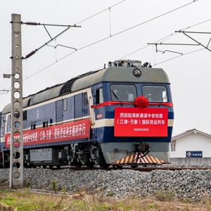 当日,首趟陆海新通道中老铁路(江津-万象)国际货运列车在重庆江津珞璜物流园片区的小南垭铁路物流中心正式发车,共运载37个集装箱,货值约400万元,包括化工品、建筑材料、通用机械、日用百货等。