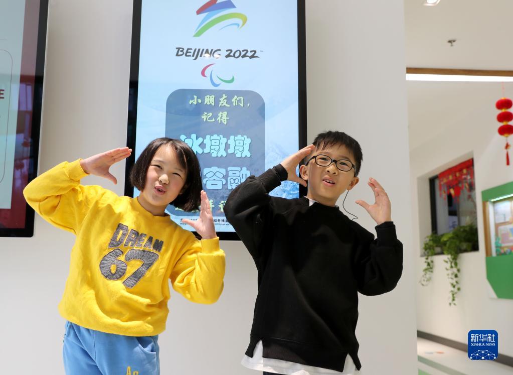 3月3日,上海市第四聋校的小学生们示范“雪容融”的手语。