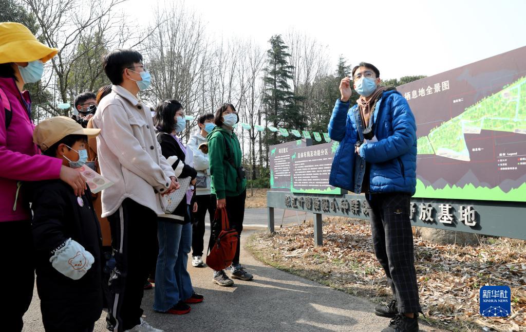 3月3日,工作人员向参观者讲解松江叶榭獐极小种群恢复与野放基地内獐的生存情况。